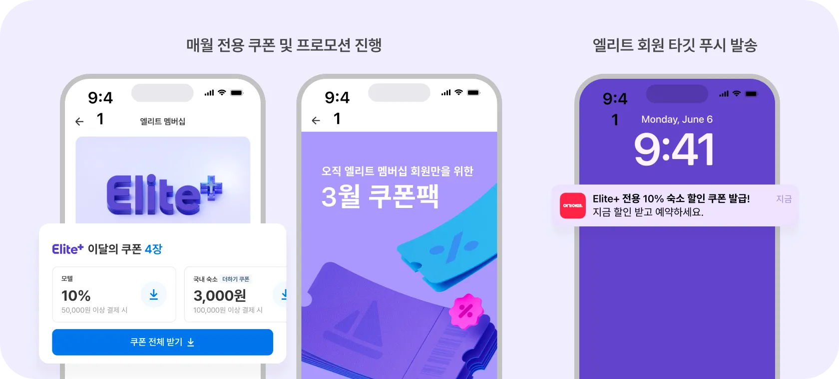 엘리트 멤버십은 베이직, 엘리트, 엘리트 플러스로 총 세 등급으로 구성되어 있어요. 그중 엘리트 플러스 회원은 일반 회원보다 구매 빈도가 4배 이상 높은 여기어때 충성 고객이에요. 해당 등급을 대상으로 할인 객실을 제공한다면 숙소 매출을 보다 공격적으로 늘리고, 공실을 비약적으로 줄일 수 있어요.