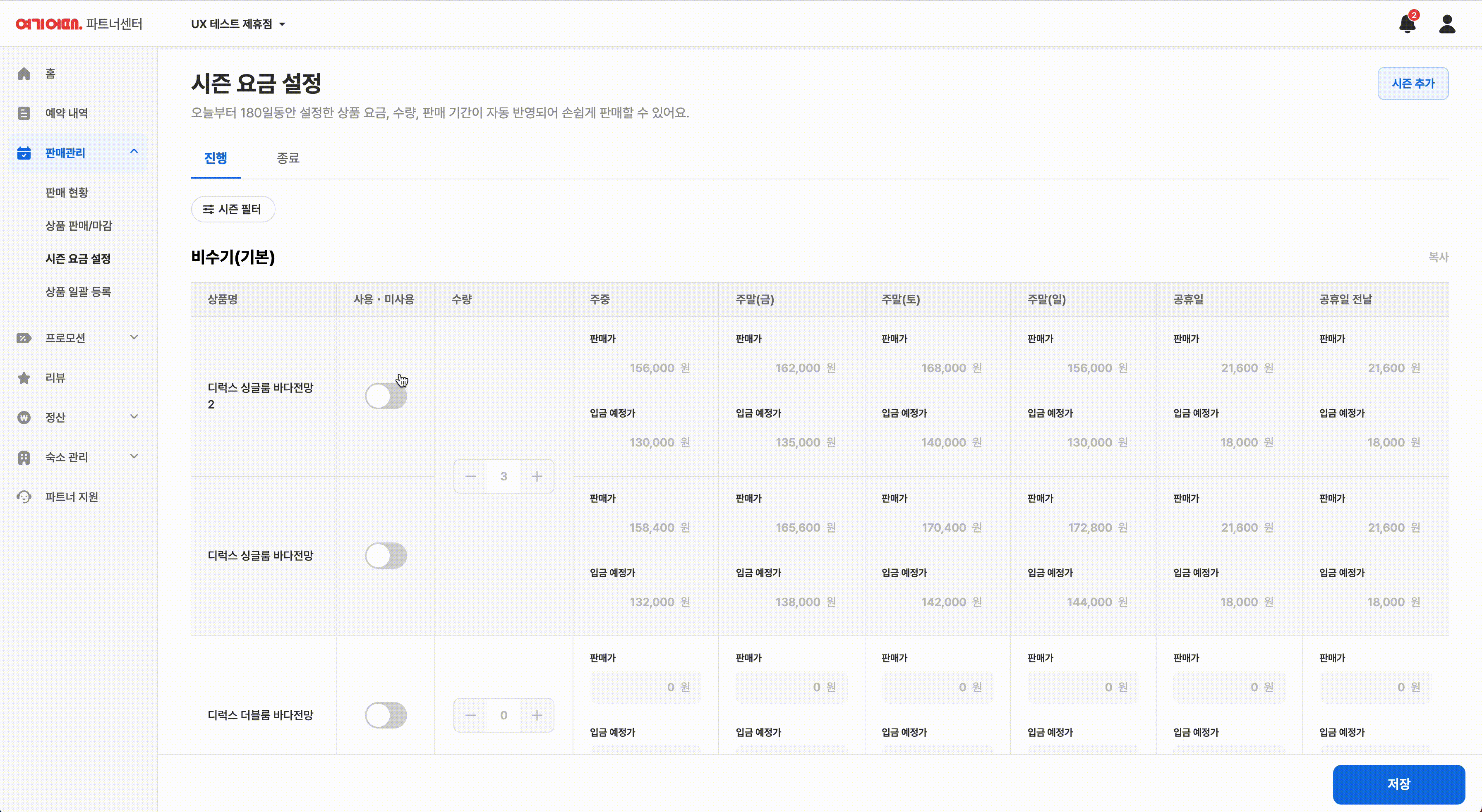 하단의 저장 버튼을 누르면 비수기 요금이 등록돼요.