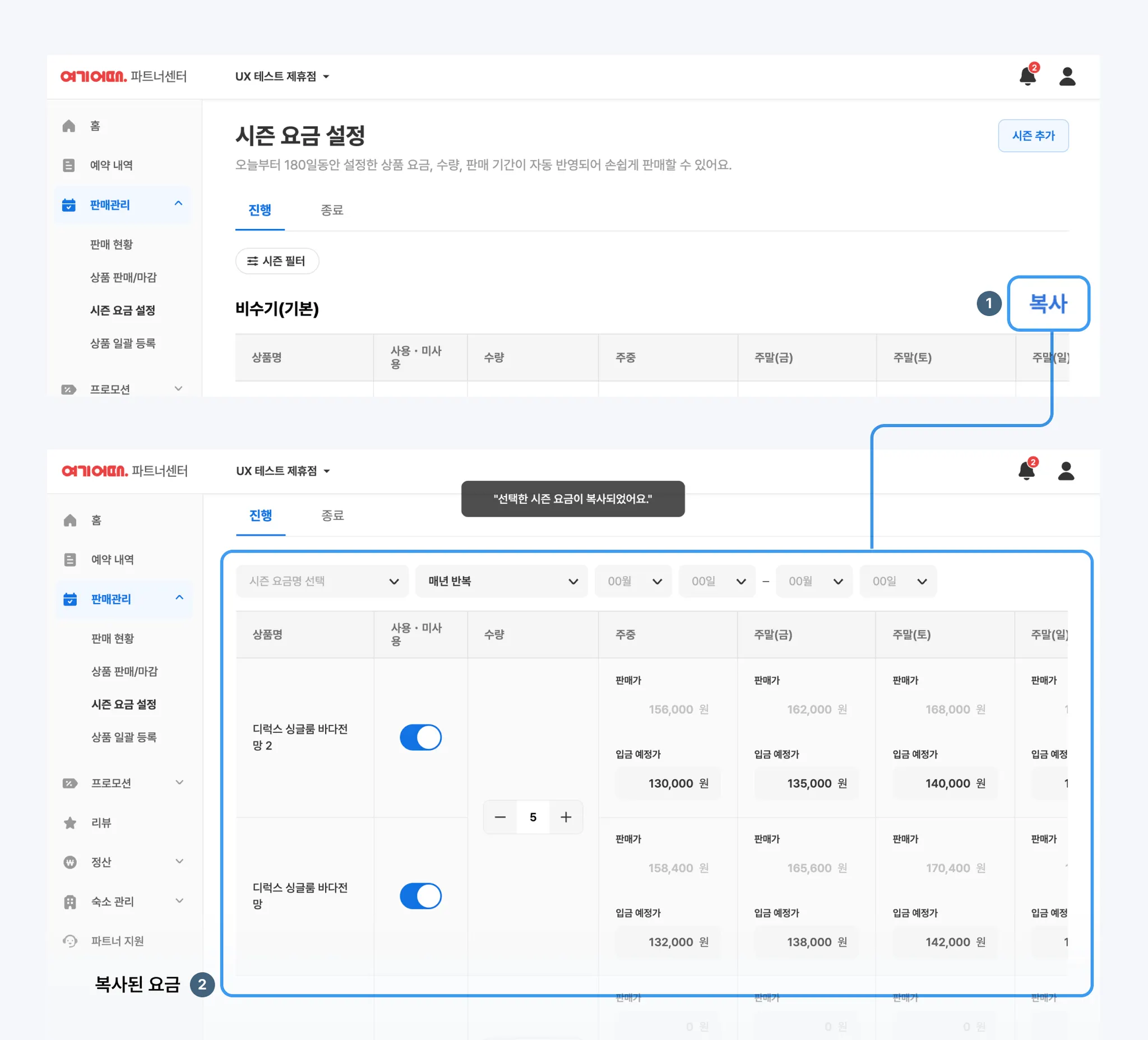 복사 버튼 하나로 효율적으로 시즌 요금을 만들 수 있어요.