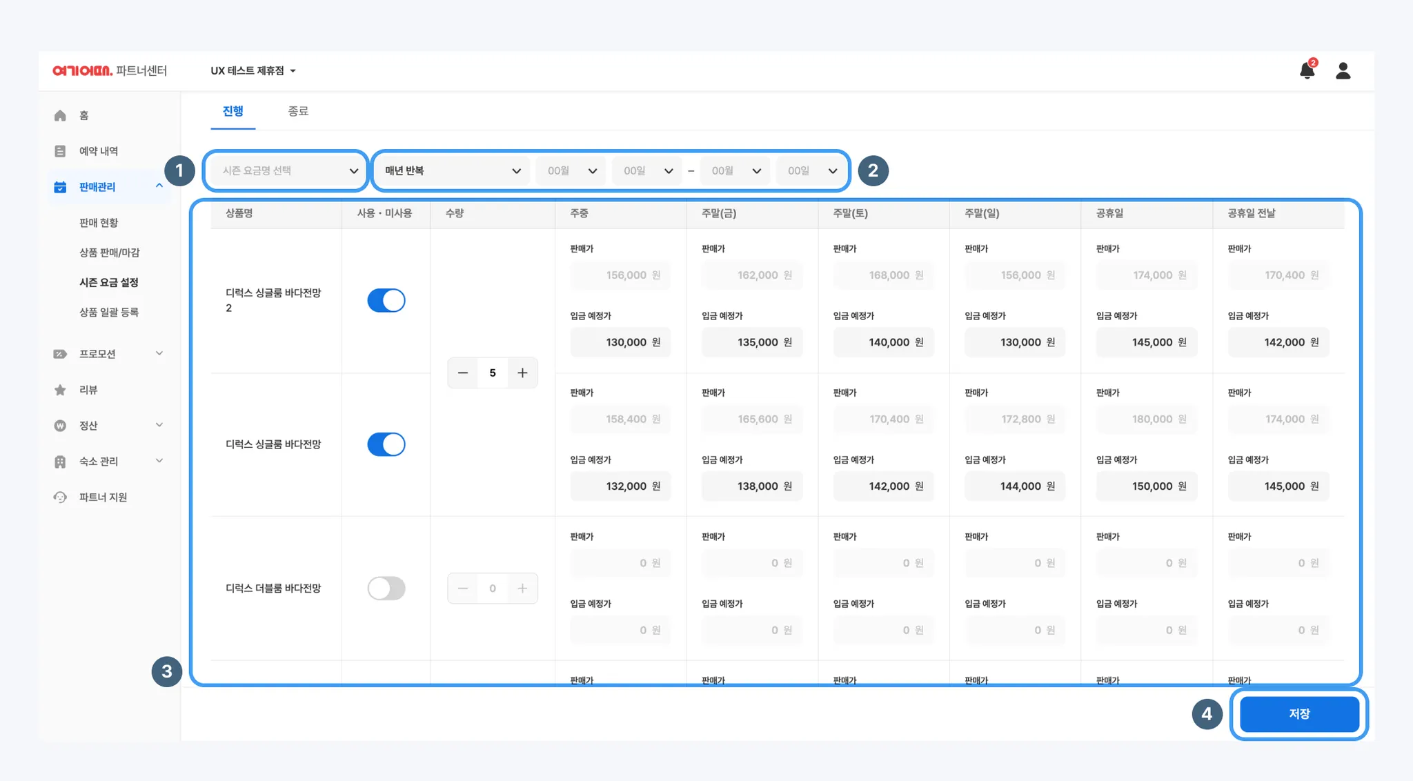 맨 아래 저장 버튼을 누르면 설정한 시즌 요금이 등록돼요.