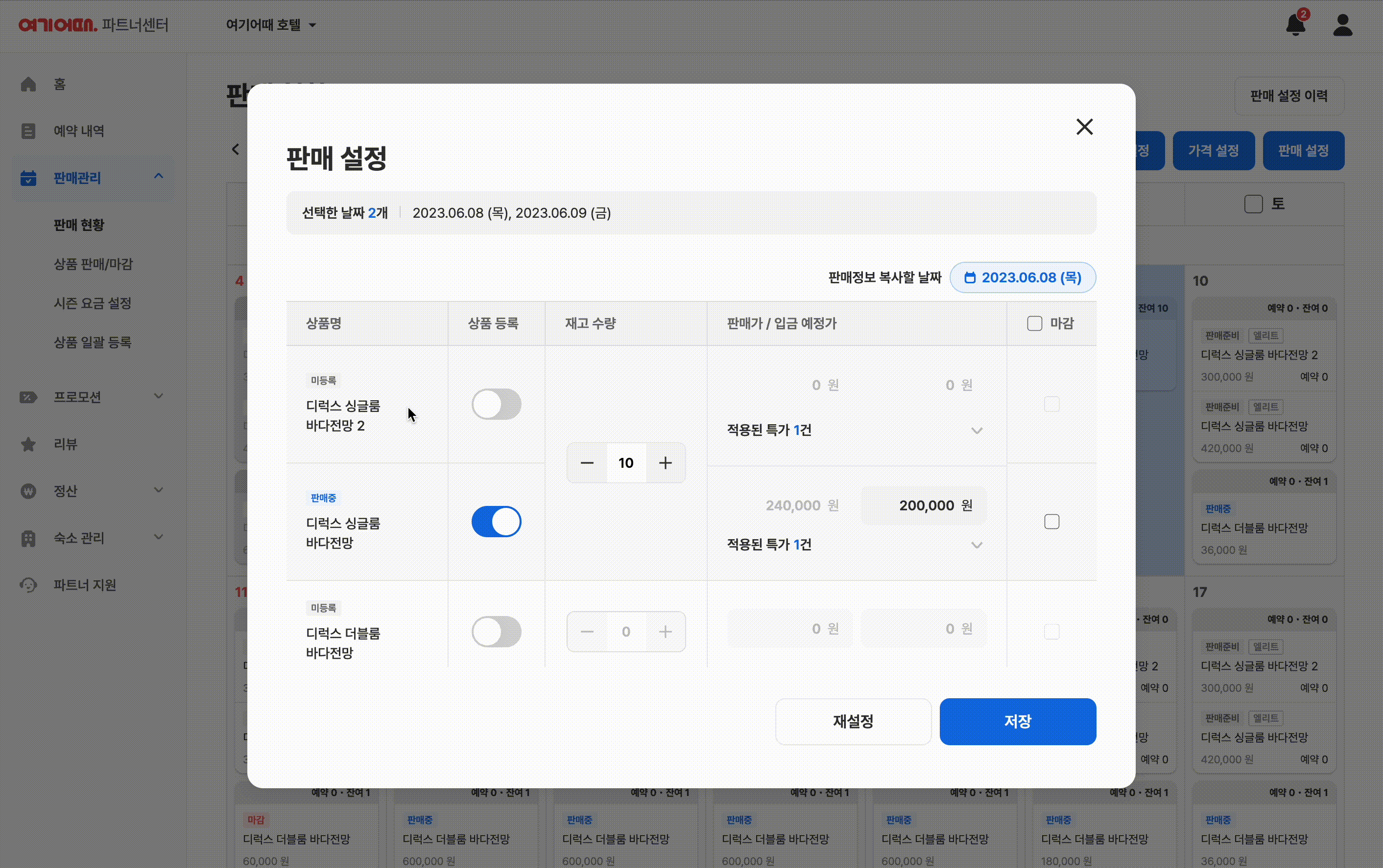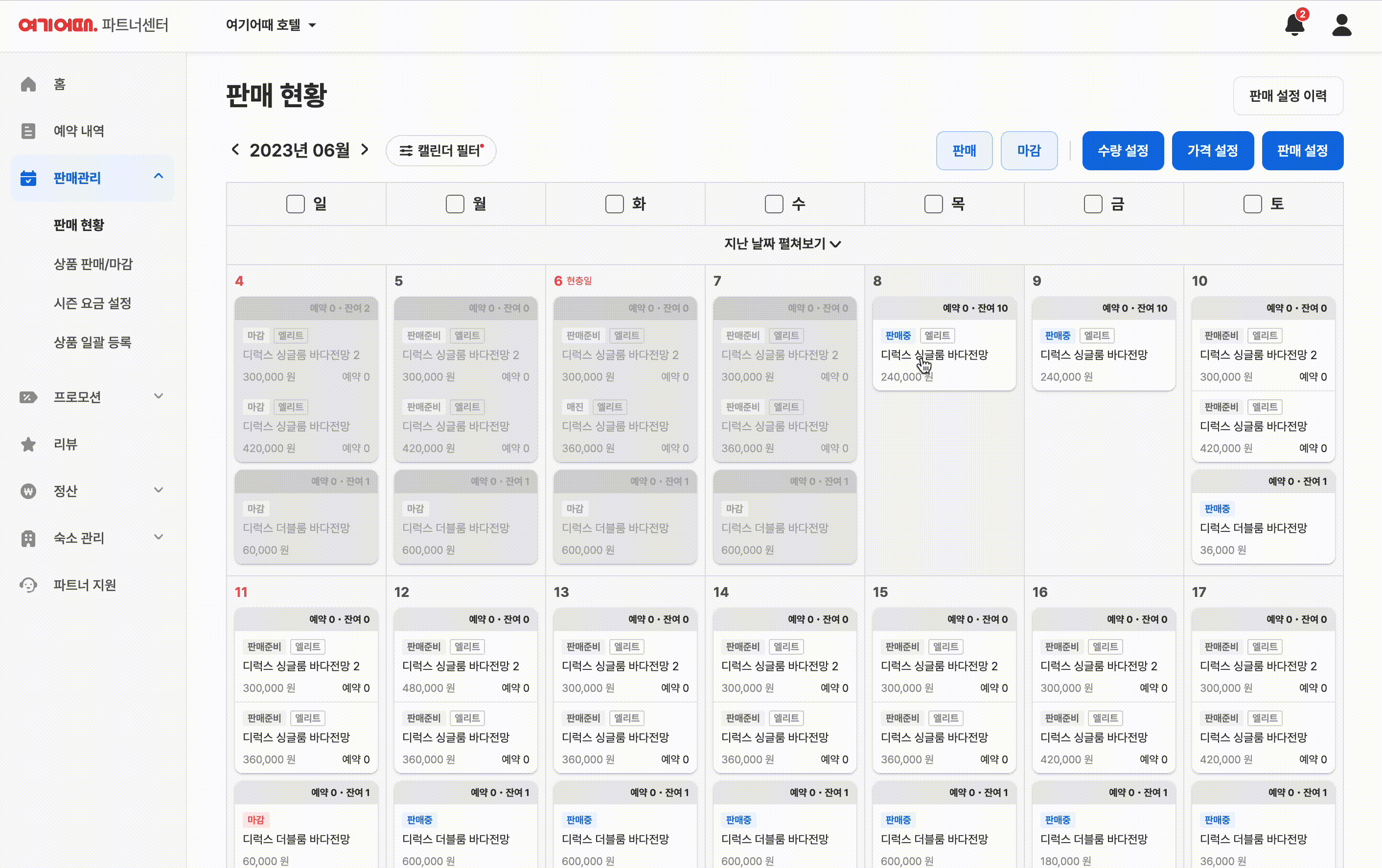 캘린더 오른쪽 상단의 판매 설정 버튼을 눌러주세요.