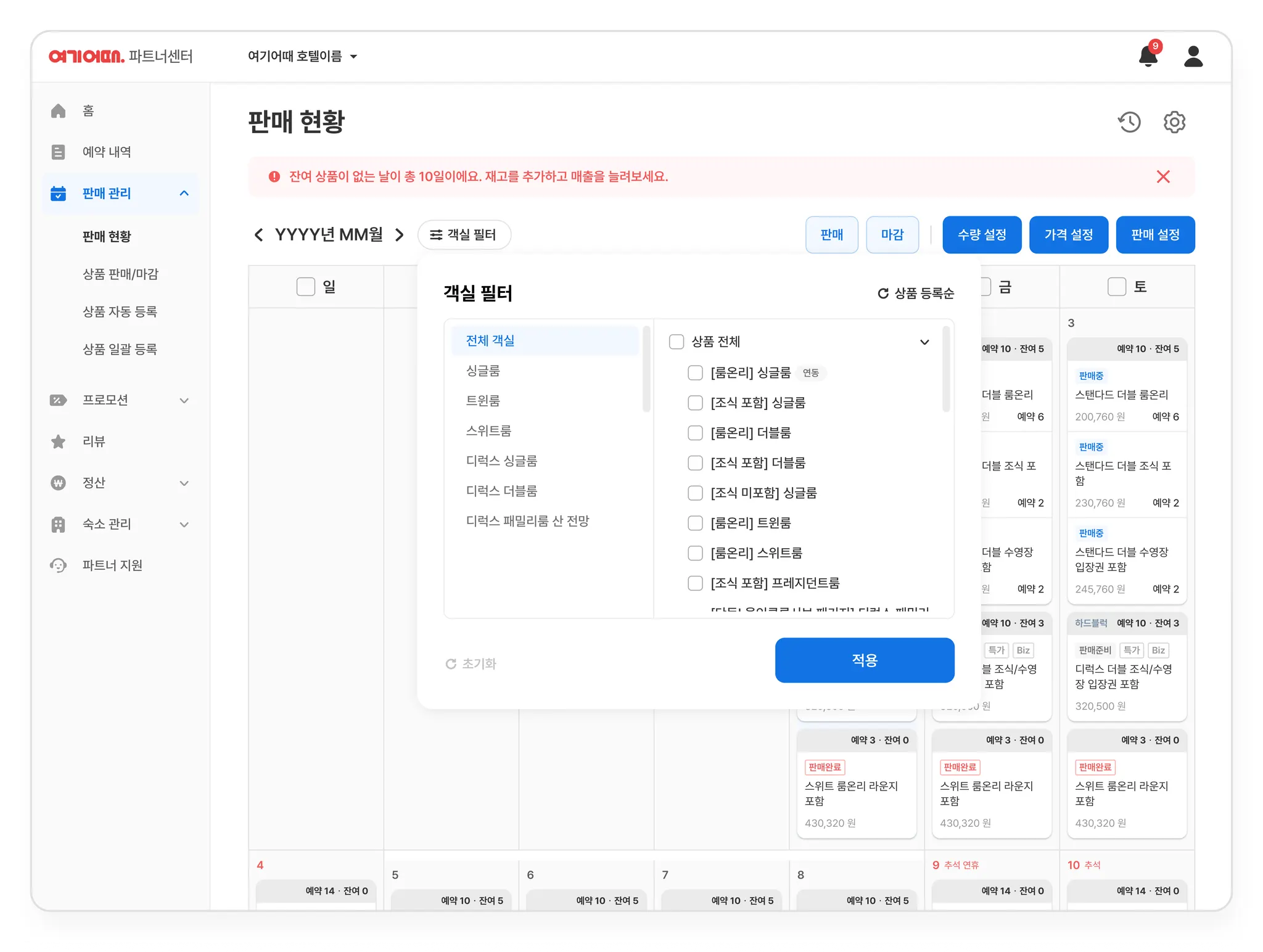 ‘객실 선택’ 필터를 이용하면 캘린더에서 보고 싶은 상품만 볼 수 있어요.