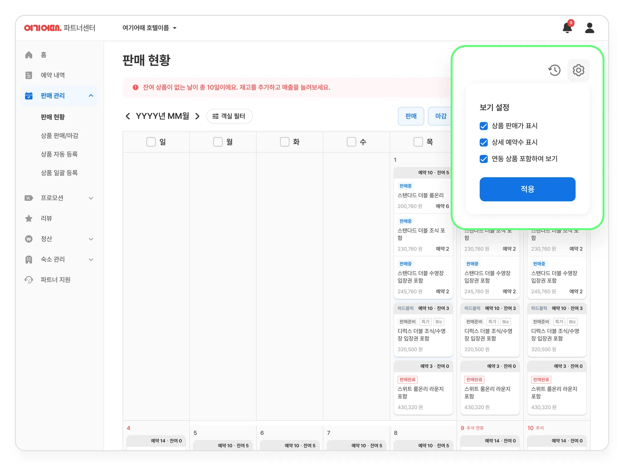 내가 원하는 대로 캘린더 보기 방식을 설정할 수 있어요. 예를 들어, 특정 상품만 캘린더에 모아보거나 캘린더에서 가격과 수량을 보고 싶지 않을 때 이 기능을 써보세요.