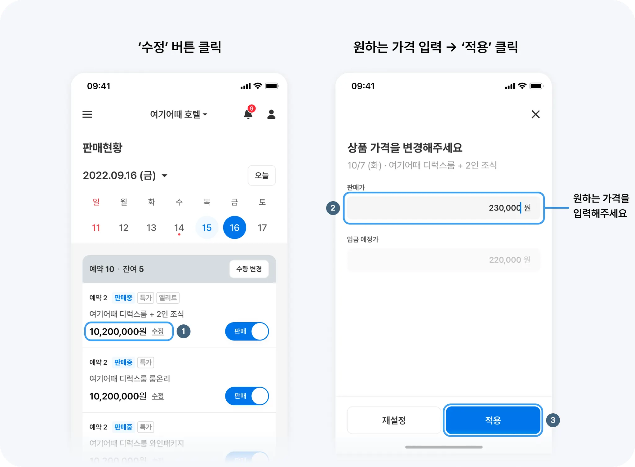 언제 어디서든 모바일로 빠르게 가격을 변경할 수 있어요. 예를 들어, 객실 판매가를 잘못 등록했더라도 당황하지 않고 모바일로 바로 바꿀 수 있어요.
