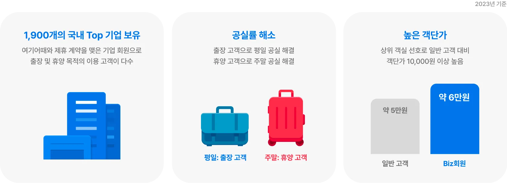 여기어때와 제휴 계약을 맺고 여기어때를 이용해 출장 및 휴양을 떠나는 1,900개의 기업 회원에게 할인 객실을 제공해 매출을 늘릴 수 있어요.