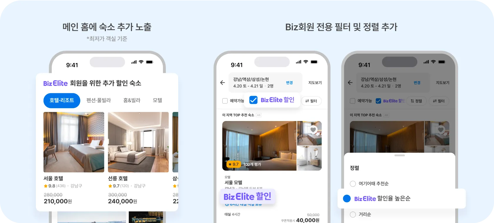 Biz회원 할인 전용 필터와 정렬 기능을 추가하여 파트너님의 숙소 도달률을 올려드려요.
