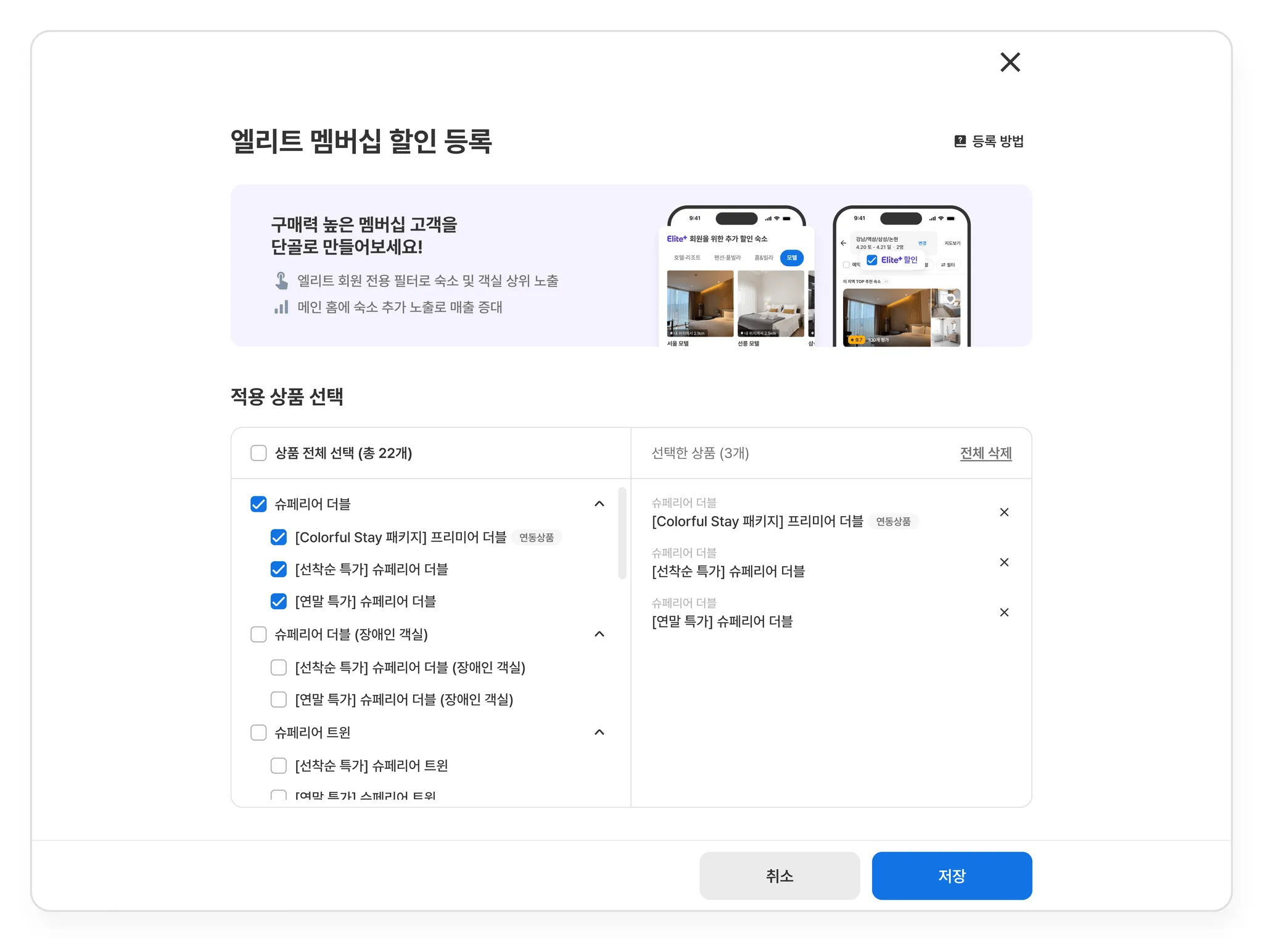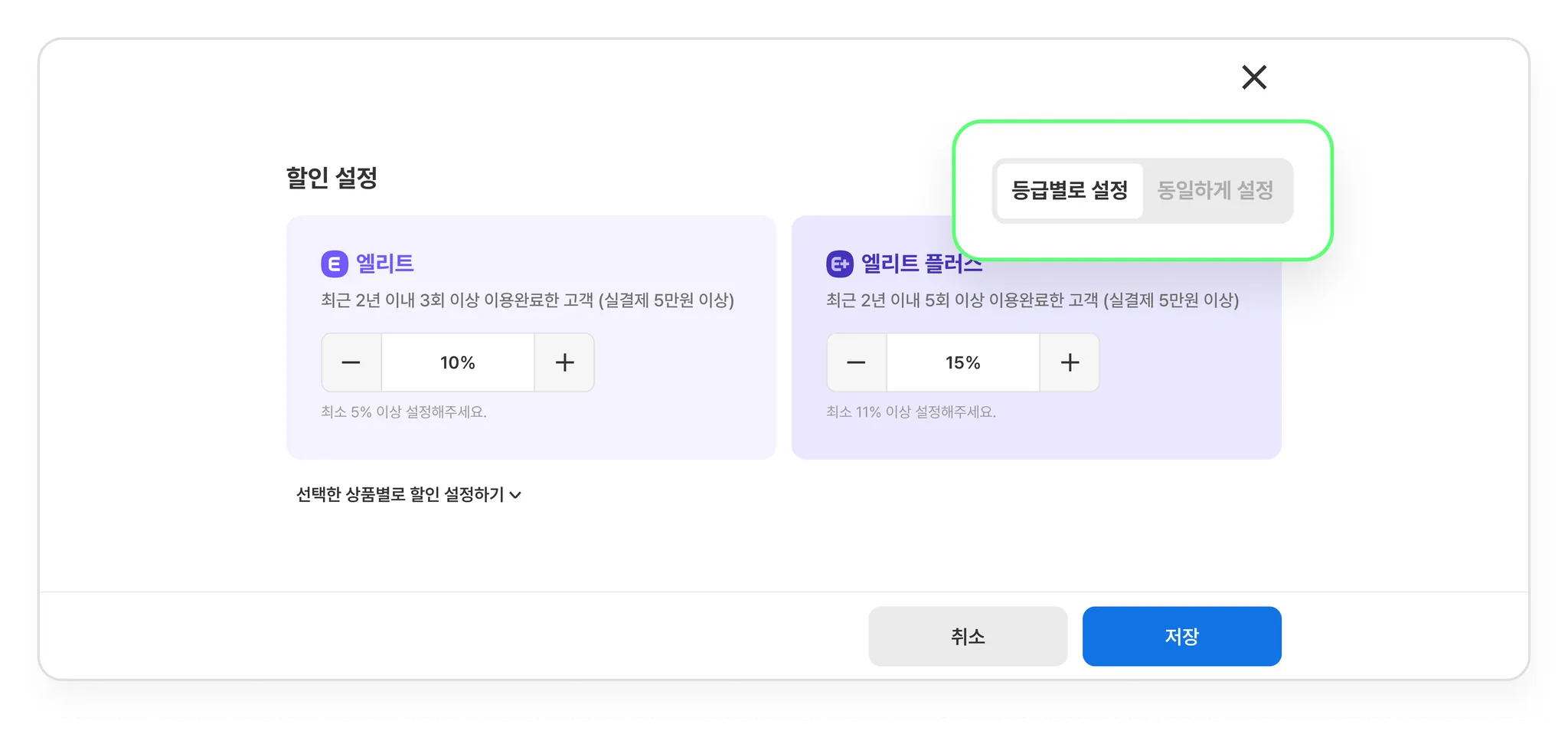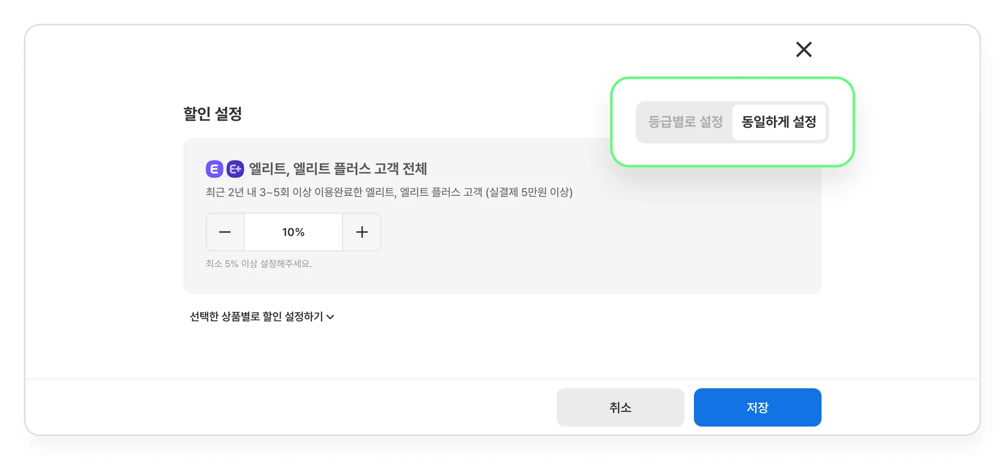 엘리트, 엘리트 플러스 등급 모두 동일한 할인율을 일괄로 설정할 수 있는 기능이에요. 예를 들어, 엘리트와 엘리트 플러스 할인율을 10%로 설정하면, 멤버십 할인을 적용하기 위해 선택했던 모든 상품이 10%로 동일하게 일괄 설정돼요.