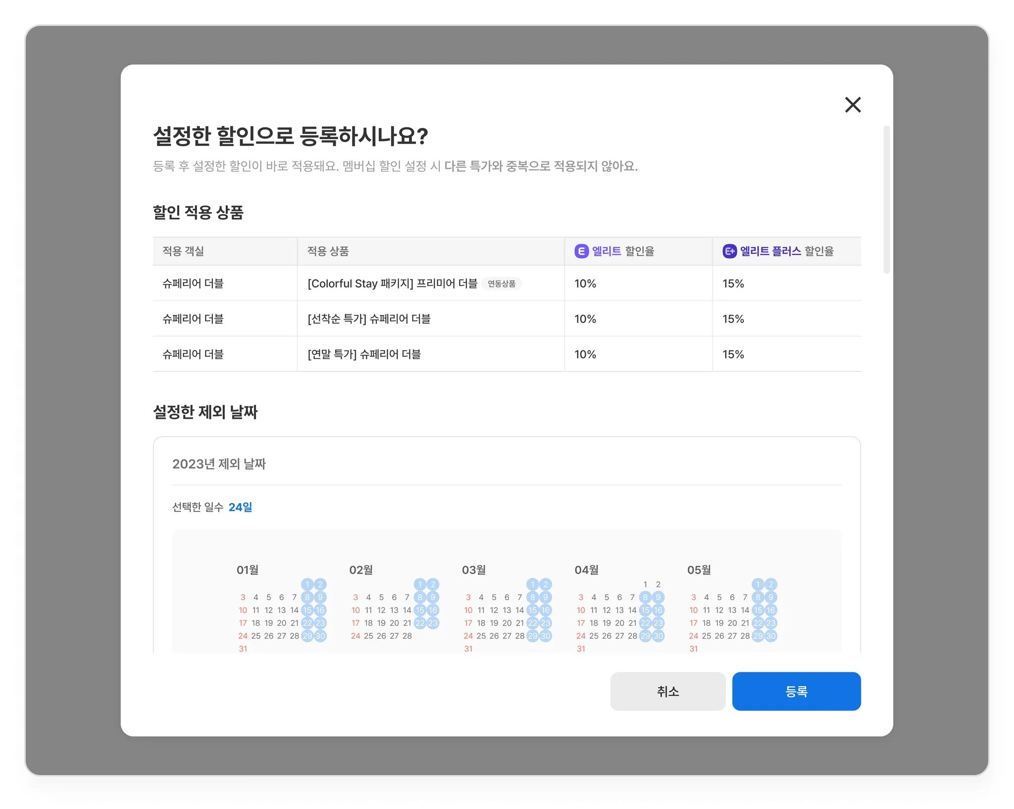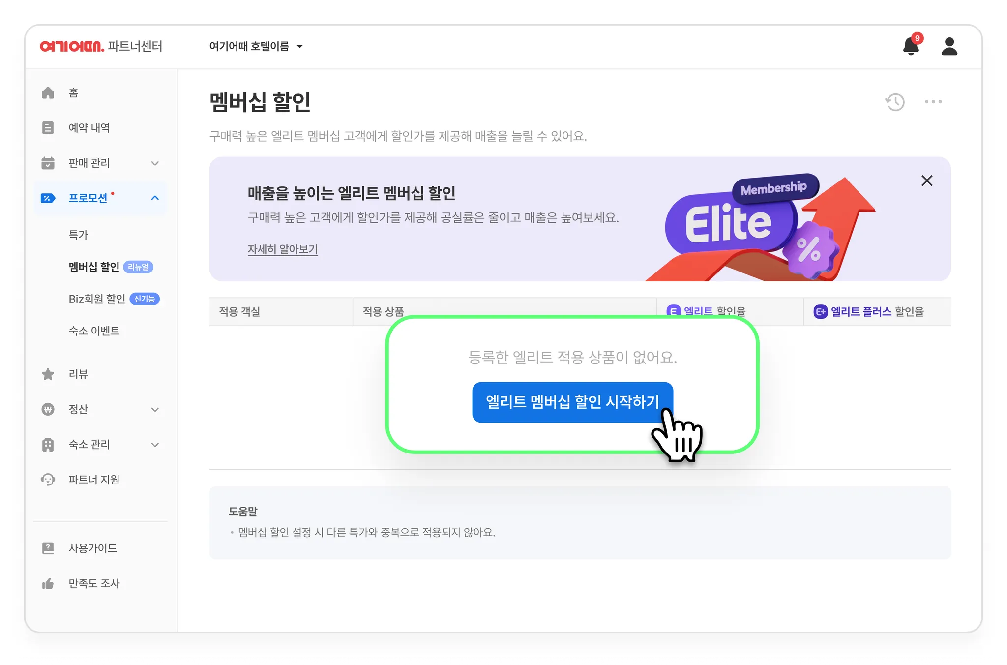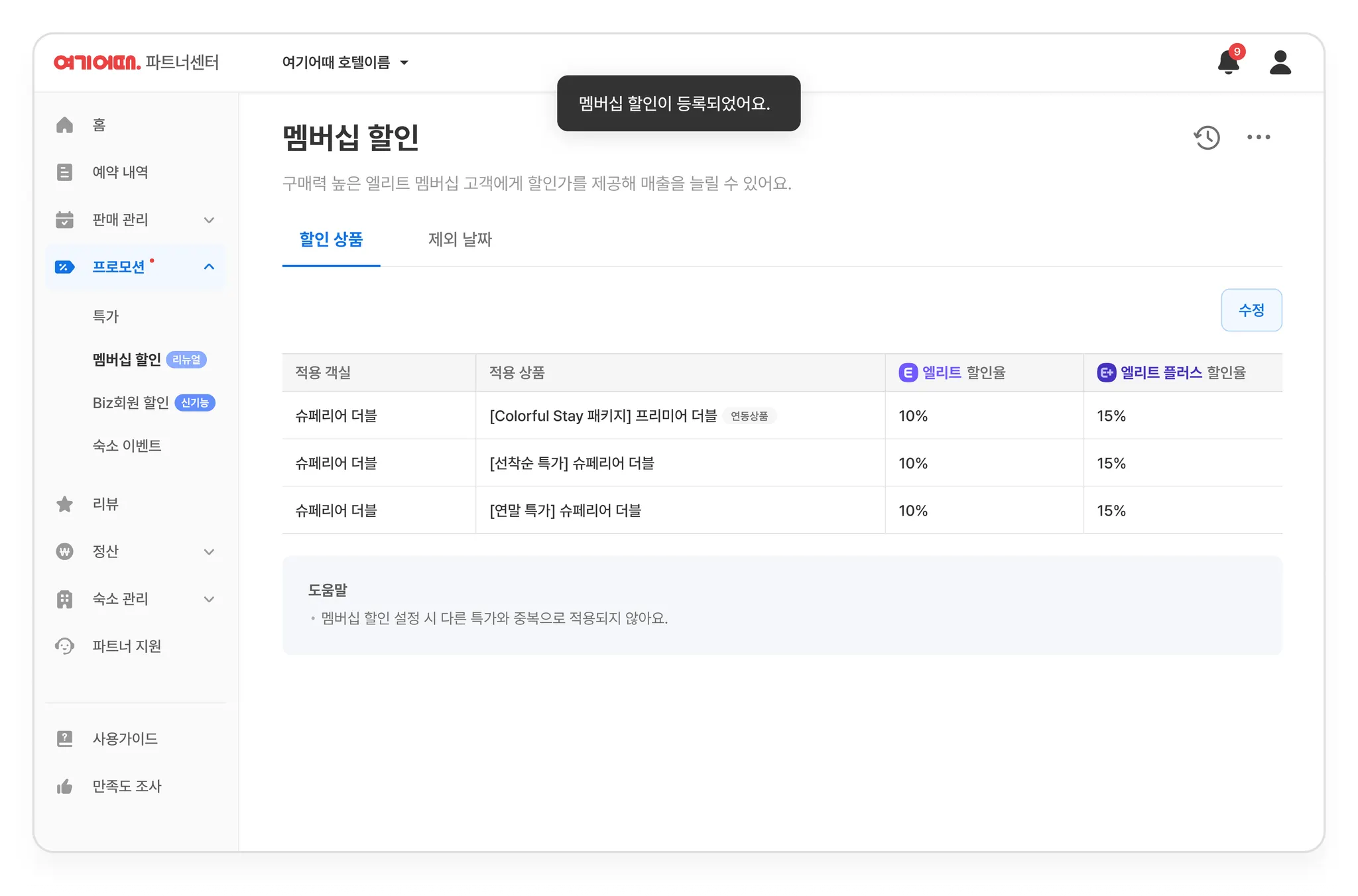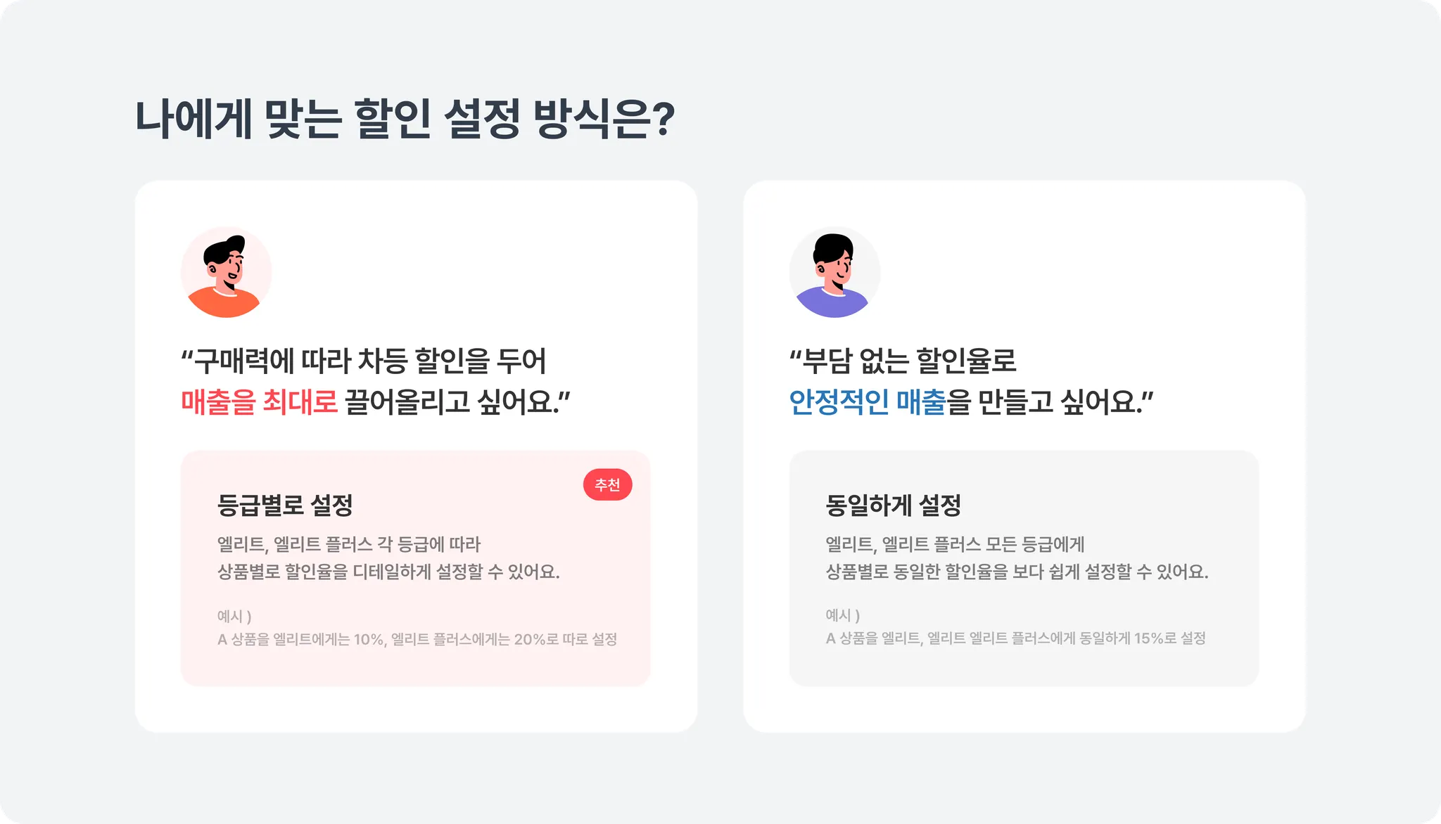 엘리트, 엘리트 플러스 등급에 따라 할인율을 다르게 설정해보세요.