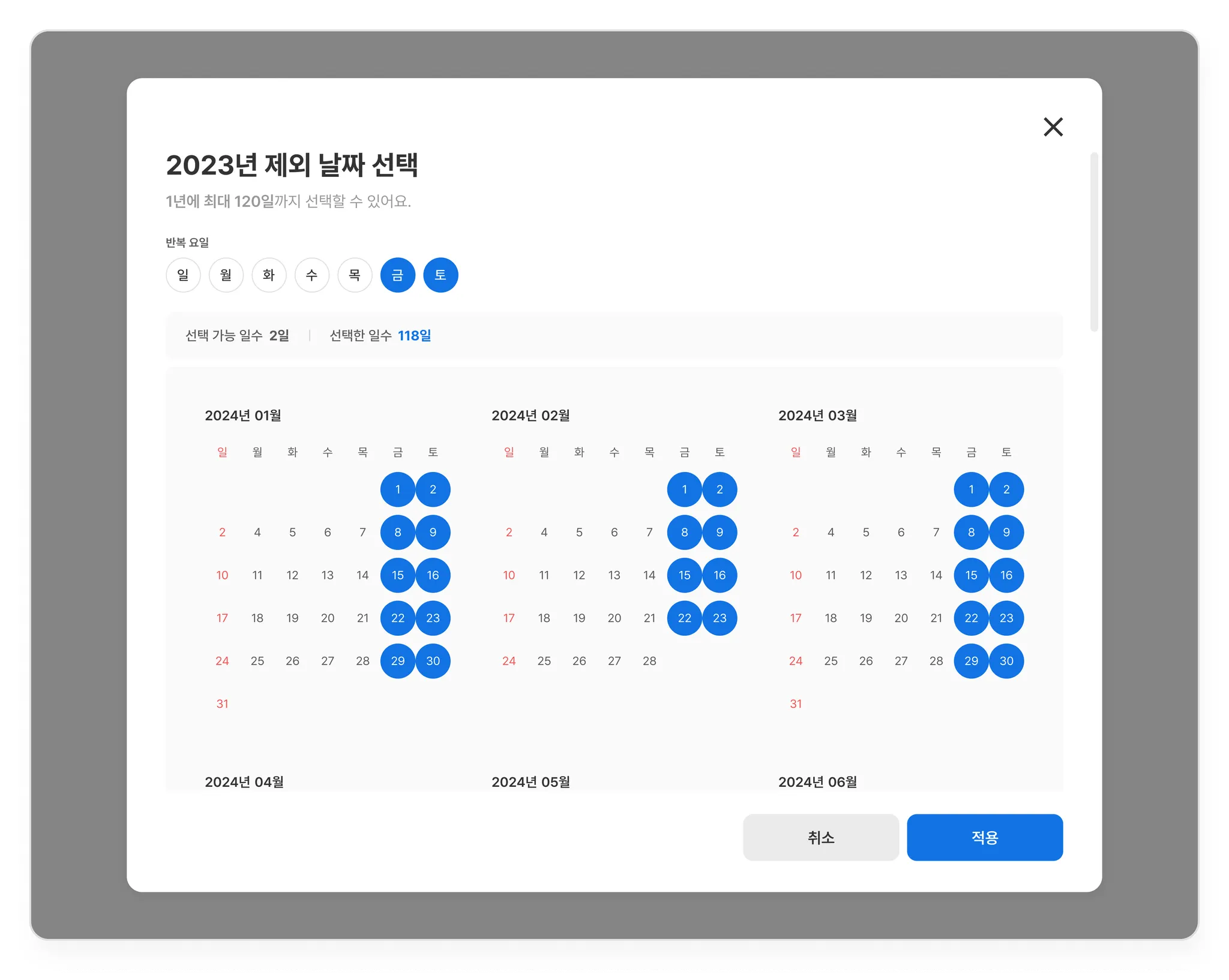 할인을 제외하고 싶은 날짜를 선택해주세요. 단, 120일만 제외할 수 있어요.