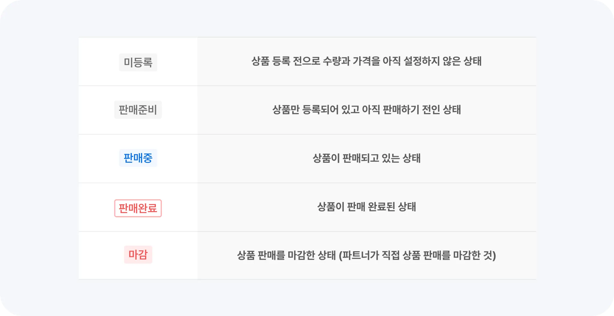 상품의 판매 상태를 5가지로 구분하고 있어요. 위에서 설명드린 상품 카드에서 아래 상태값을 실시간으로 제공하고 있어요.