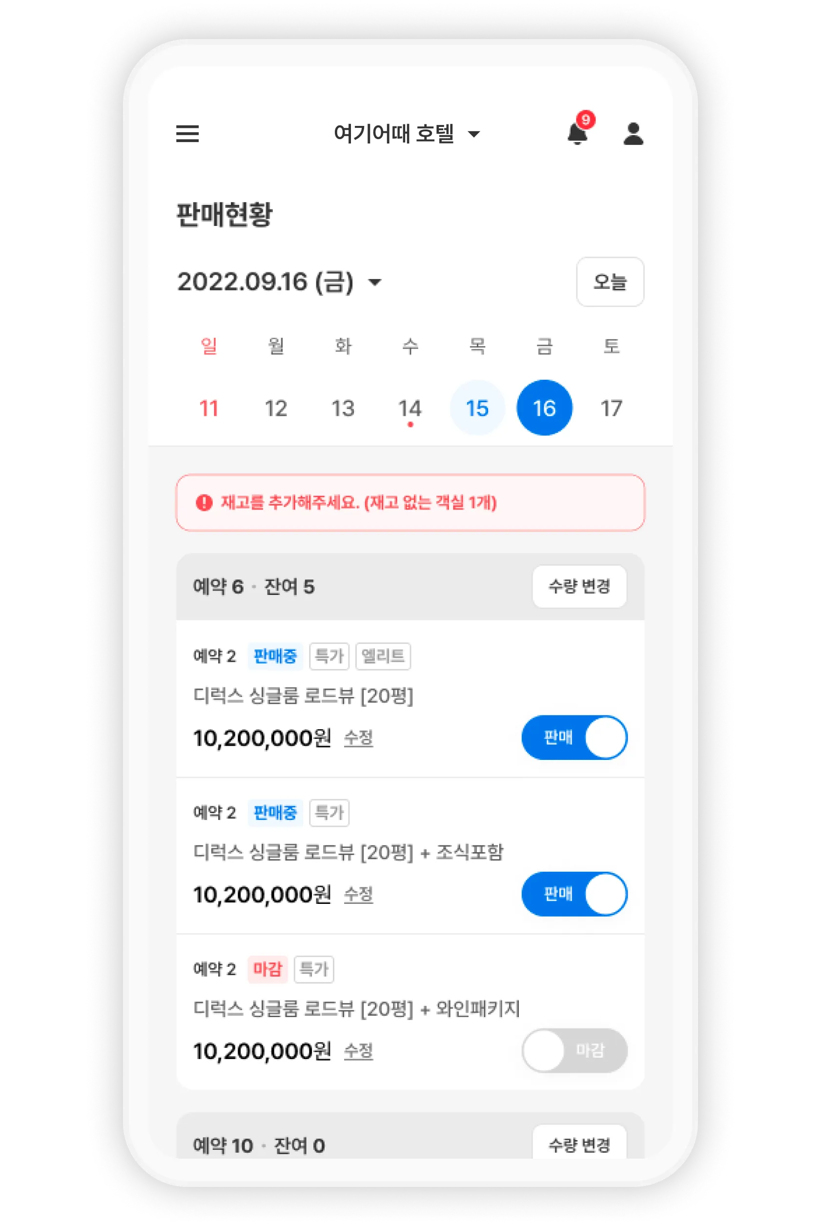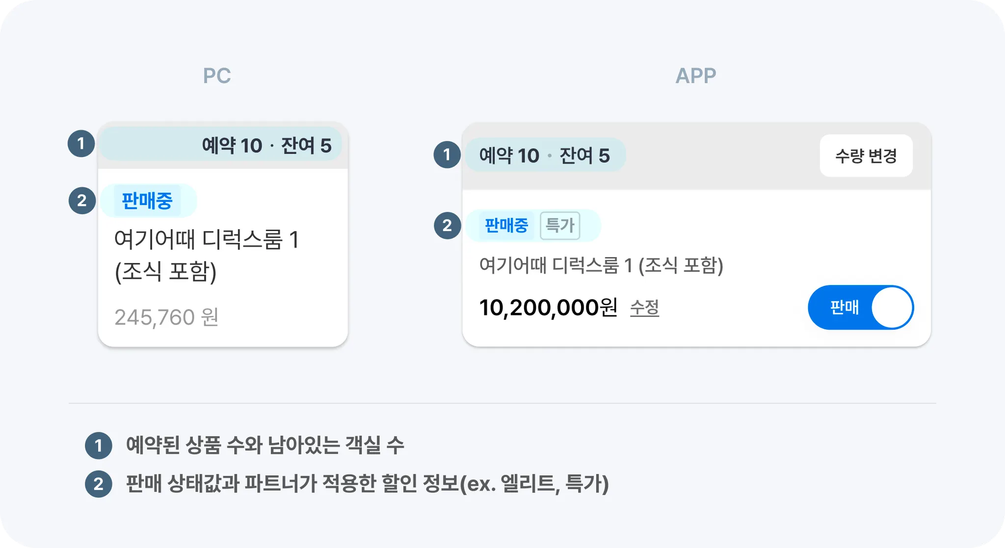 판매 상태값과 파트너가 적용한 할인 정보(ex. 엘리트, 특가)입니다.