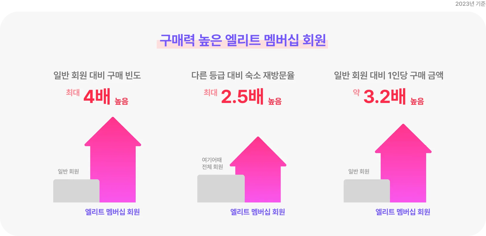 엘리트 멤버십은 베이직, 엘리트, 엘리트 플러스로 총 세 등급으로 구성되어 있어요. 그중 엘리트 플러스 회원은 일반 회원보다 구매 빈도가 4배 이상 높은 여기어때 충성 고객이에요. 해당 등급을 대상으로 할인 객실을 제공한다면 숙소 매출을 보다 공격적으로 늘리고, 공실을 비약적으로 줄일 수 있어요.