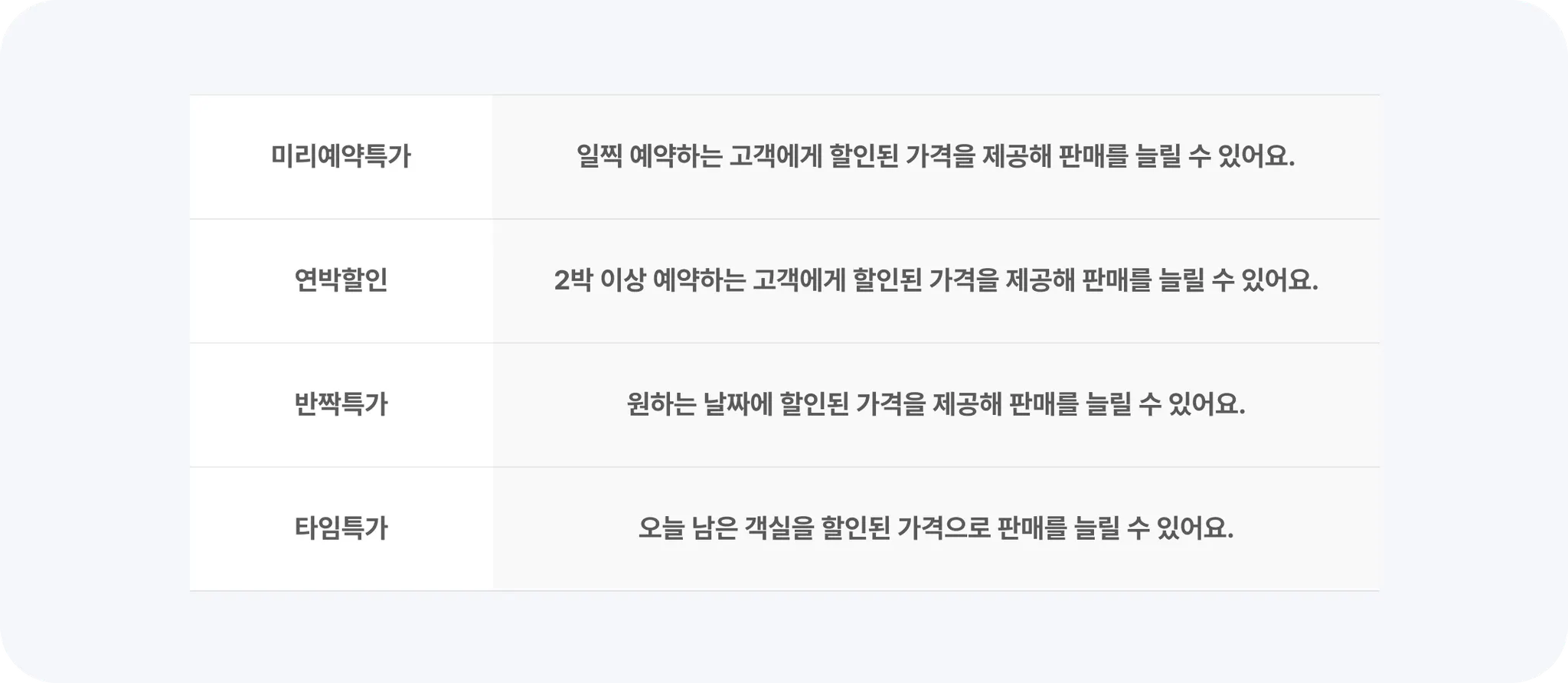 미리예약특가: 일찍 예약하는 고객에게 할인된 가격을 제공해 판매를 늘릴 수 있어요.